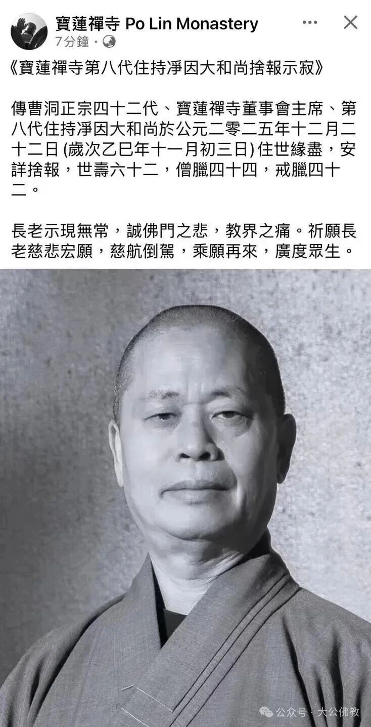 香港佛教名刹宝莲禅寺第八代住持、曹洞正宗第四十二代传人净因大和尚,于公元2025年12月22日(农历乙巳年十一月初三日)安详舍报,世寿六十有二,僧腊四十四载,戒腊四十二年。大和尚住世缘尽,示现无常,诚乃佛门之悲、教界之痛。宝莲禅寺已成立治丧委员会,依佛教仪轨筹备追思赞颂事宜。